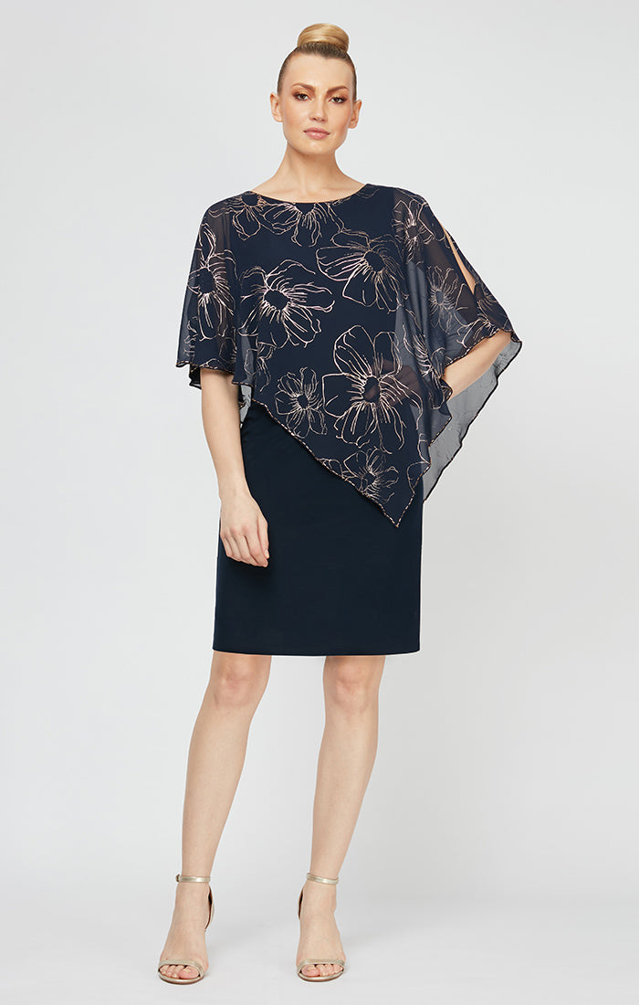 Jersey Sheath Dress with Floral Chiffon Overlay with Beaded Trim