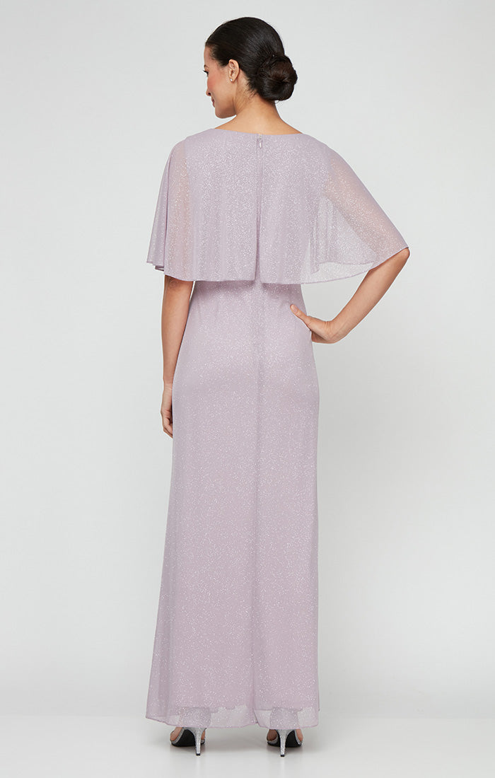 Long Glitter Mesh Dress with Embellished Elbow Sleeves and Cascade Overlay Skirt