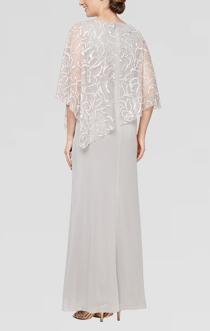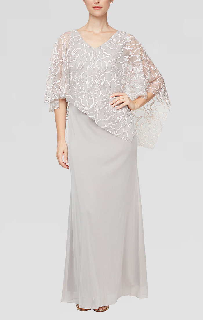 Petite V-Neck Glitter Mesh Gown with Floral Chiffon Asymmetric Cape