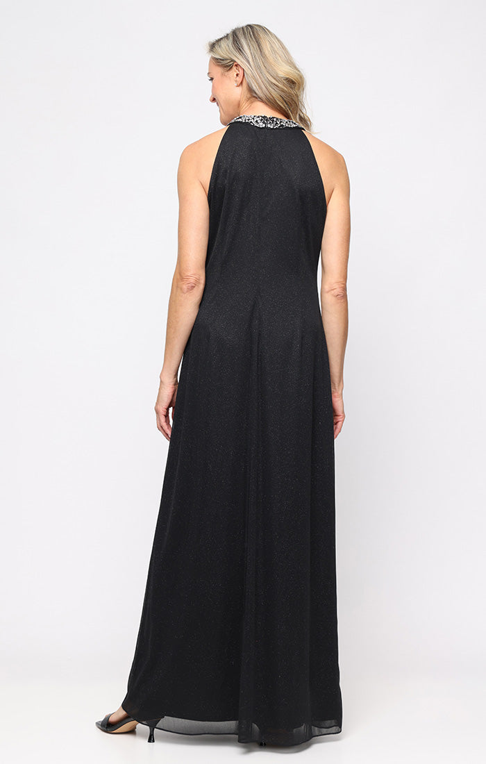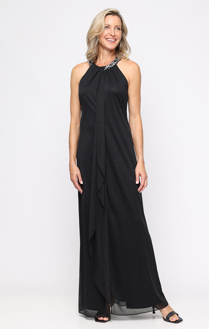 Petite Long Glitter Mesh Halter Neck Dress with Beaded Neckline and Font Cascade Detail
