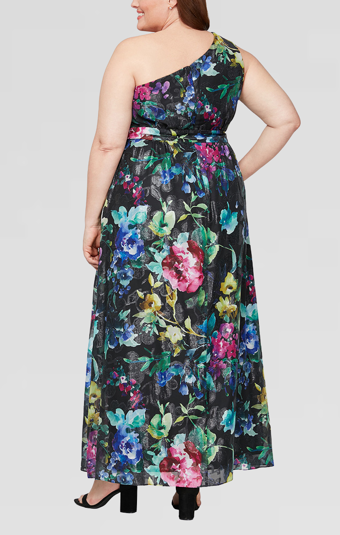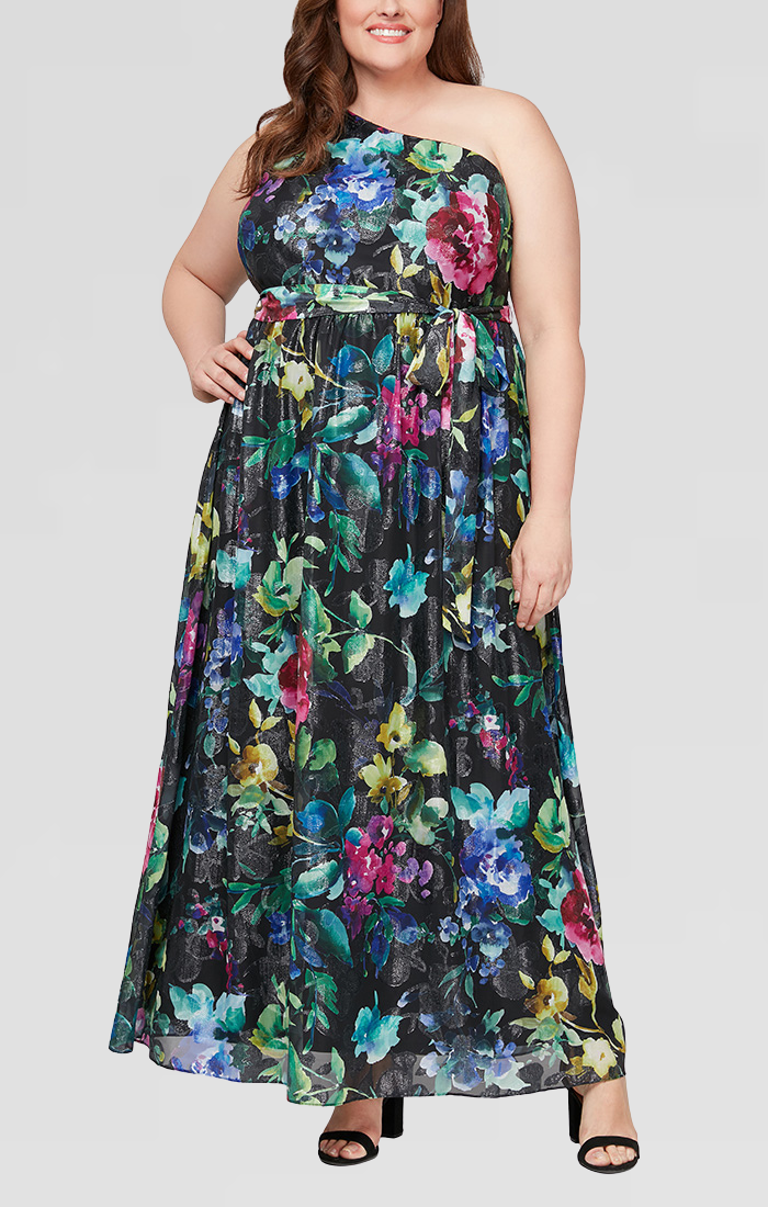 This long, one shoulder plus dress is crafted from our printed chiffon fabric. The colorful, floral design is perfect for the spring/ summer months.