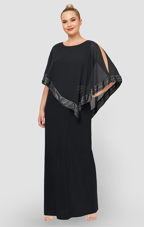 Plus Jersey Column Dress with Asymmetrical Chiffon Cape Overlay with Metallic Trim