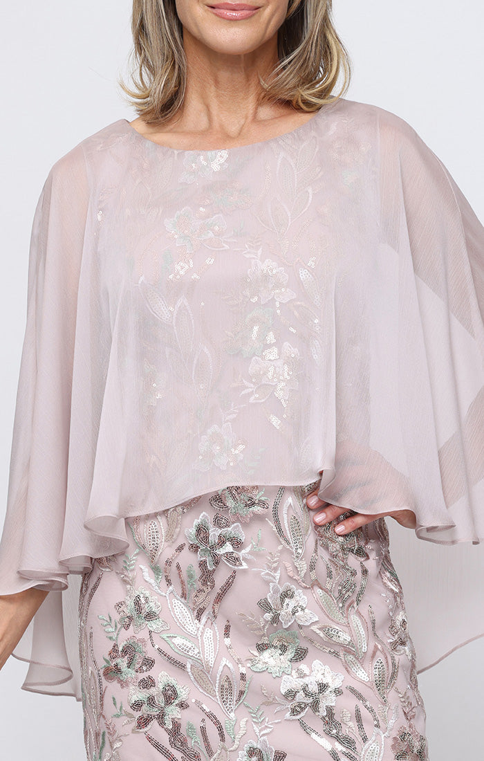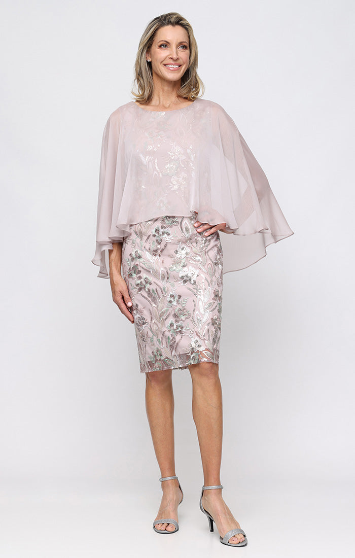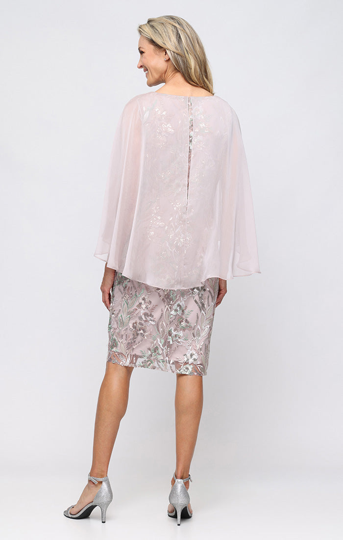Short Embroidered Sheath Dress with High/Low Chiffon Overlay Bodice