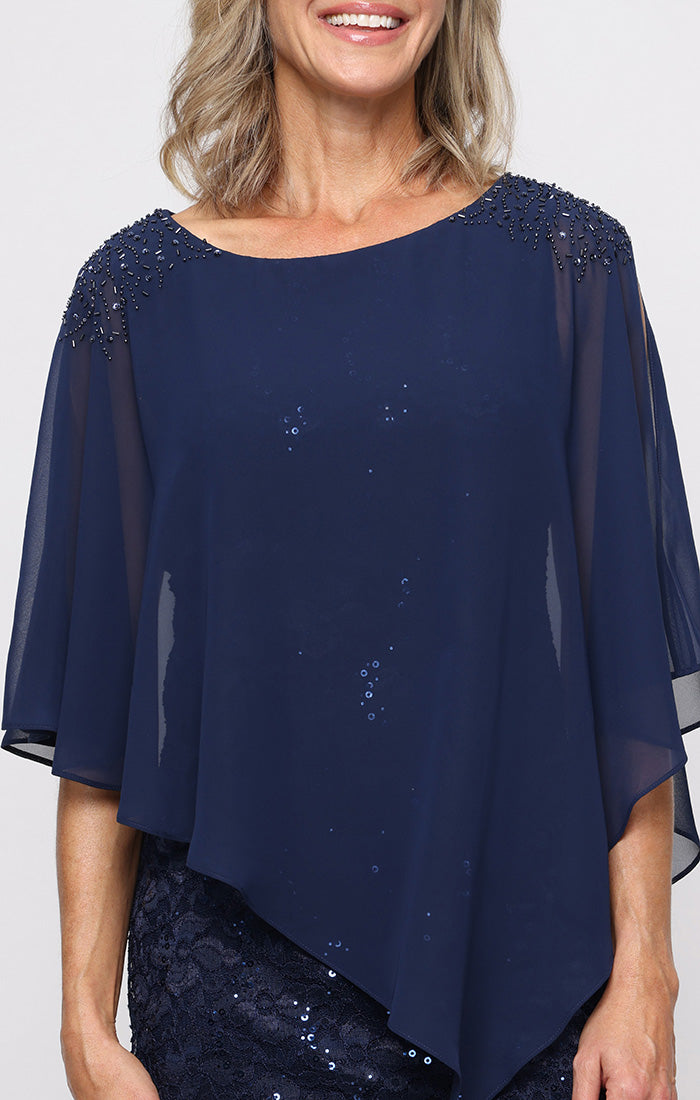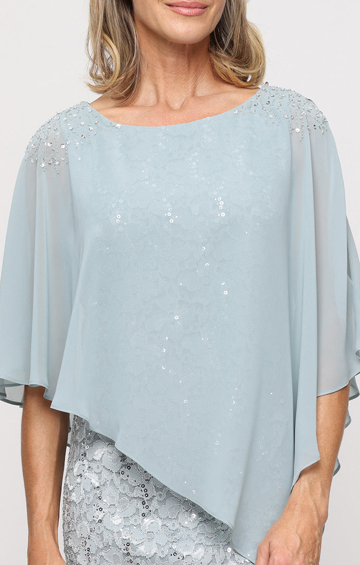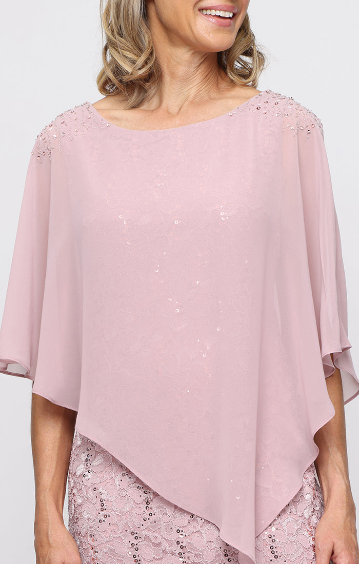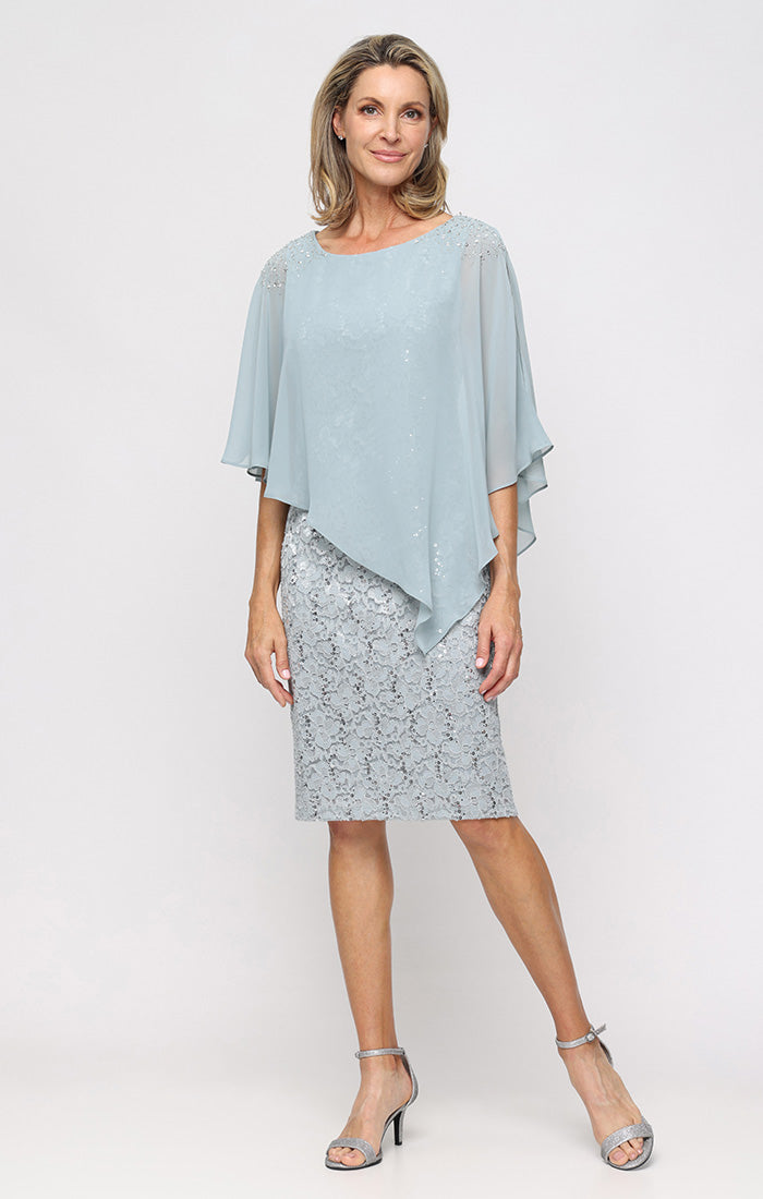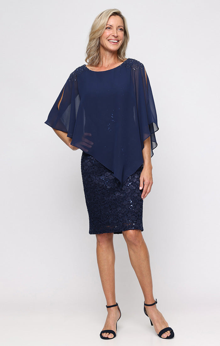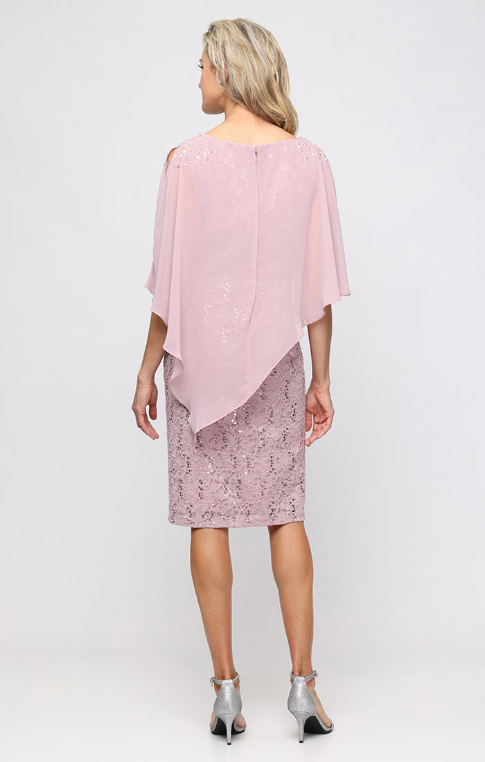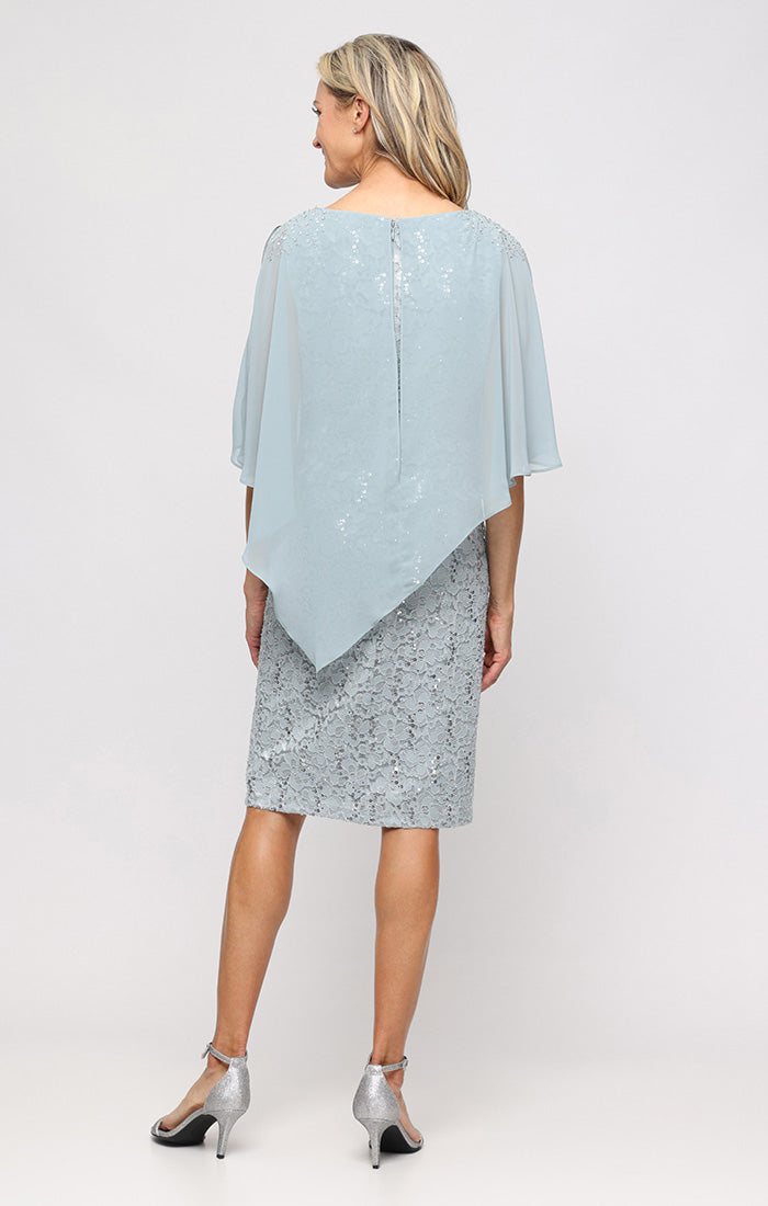Short Stretch Lace Sheath Dress with Asymmetric Chiffon Overlay and Embellished Shoulder Detail