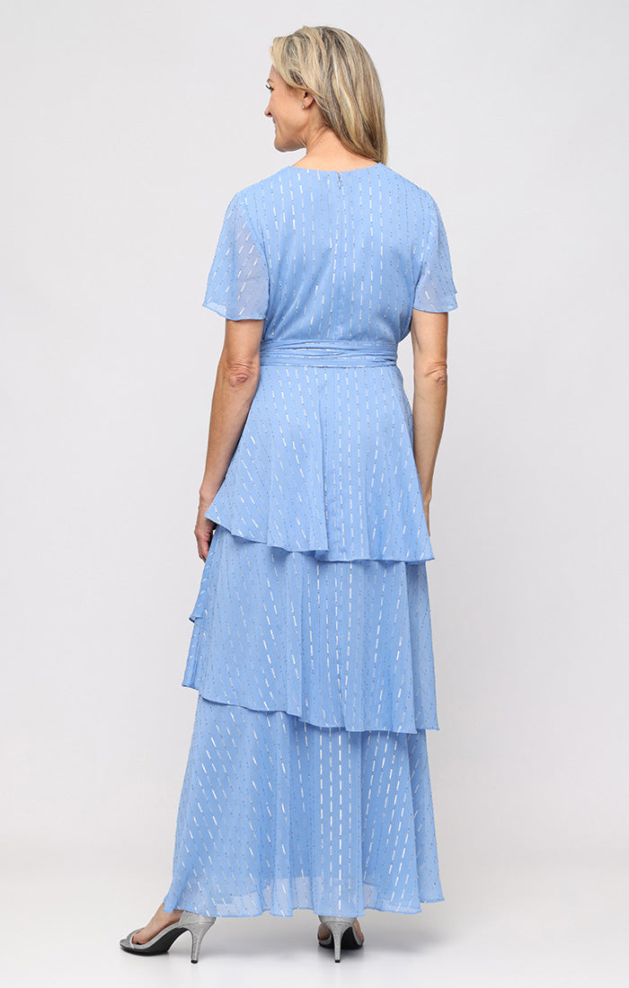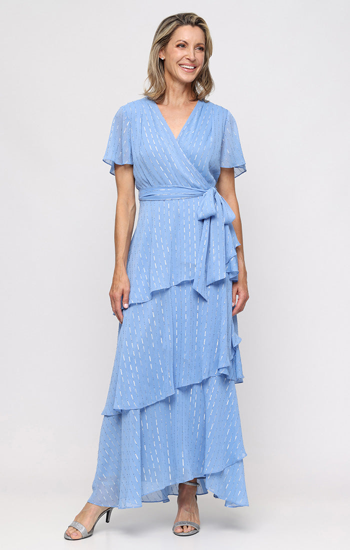 Long Solid Chiffon Maxi with Lurex Dot, Flutter Sleeves and Tiered Detail Skirt