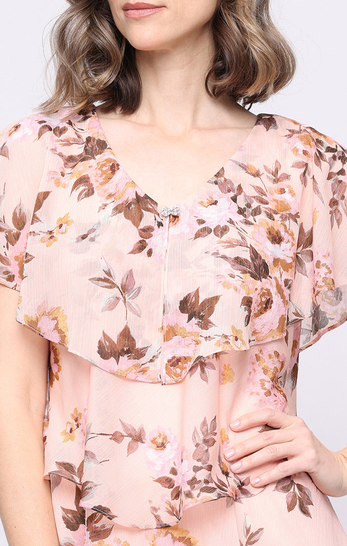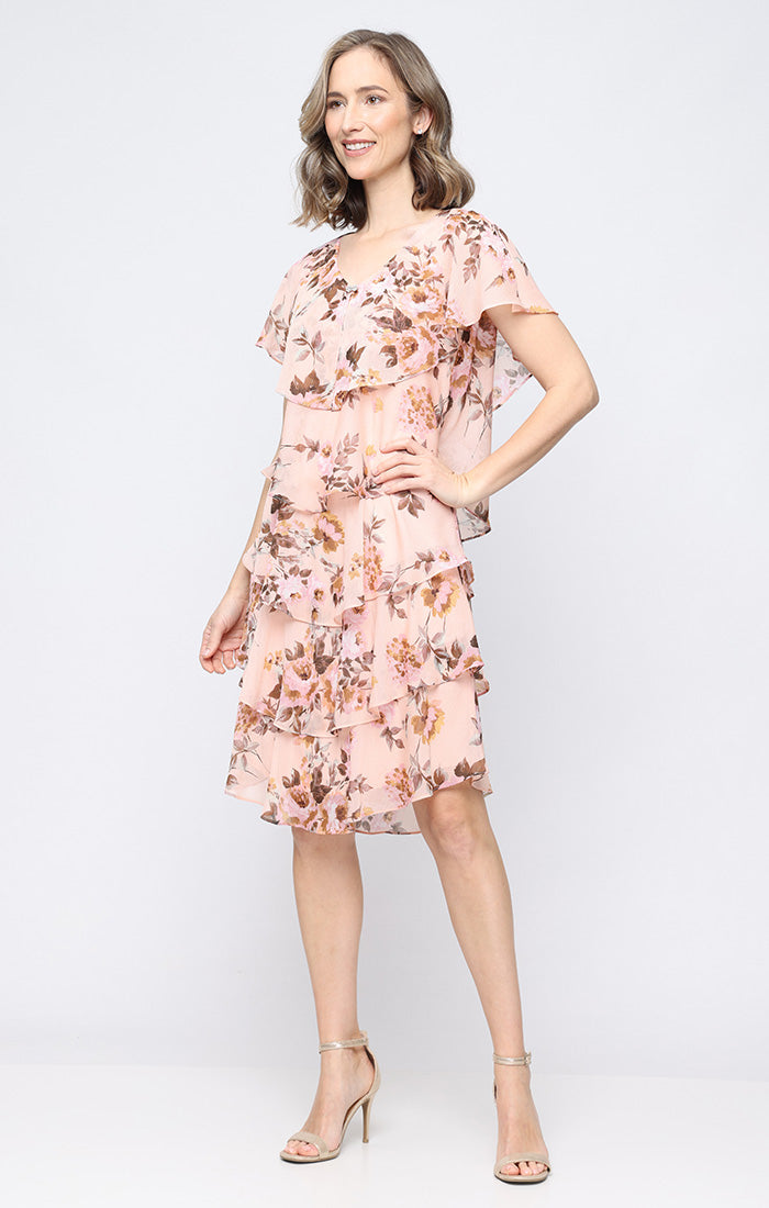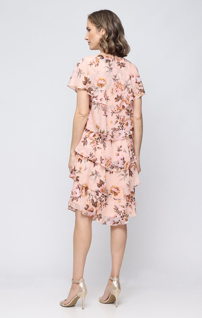 Short Printed Chiffon Tiered Dress with Embellished V-Neckline and Capelet Sleeves