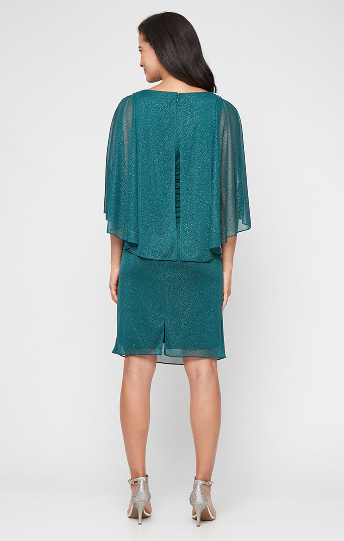 Plus Short Glitter Mesh Sheath Dress with Overlay Bodice and Embellishment Detail at Shoulders