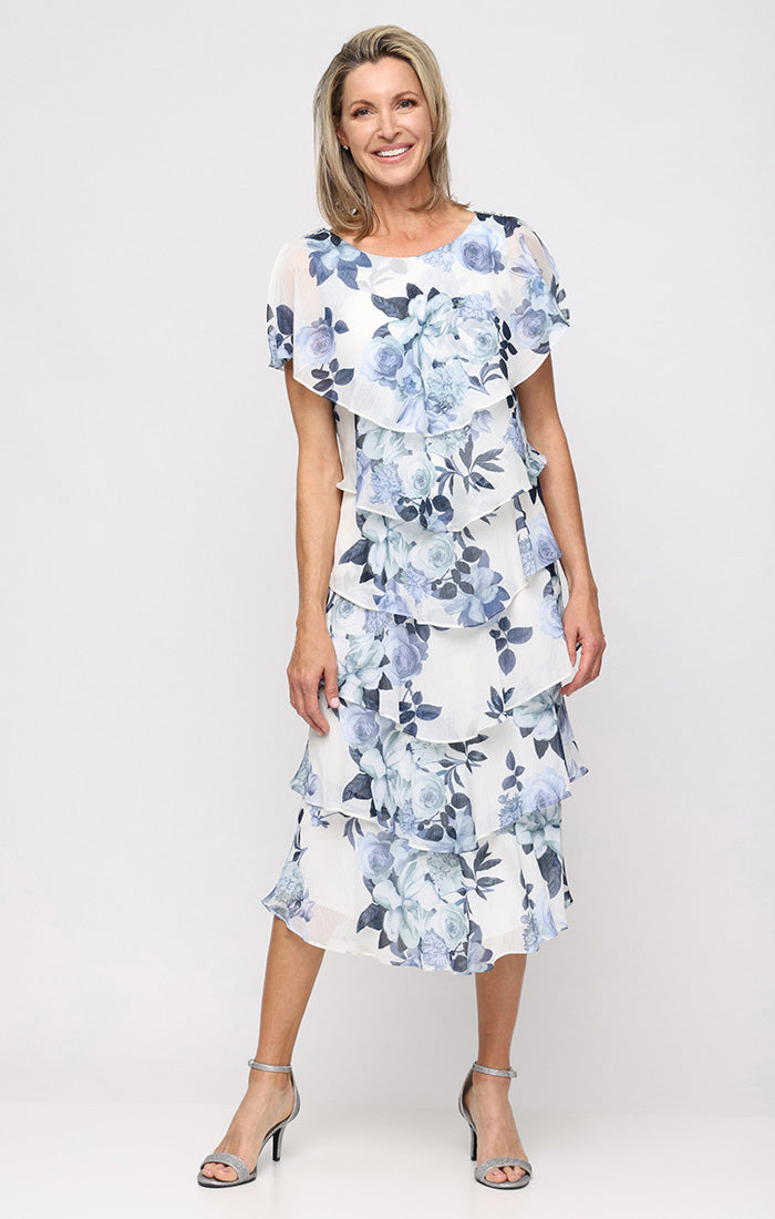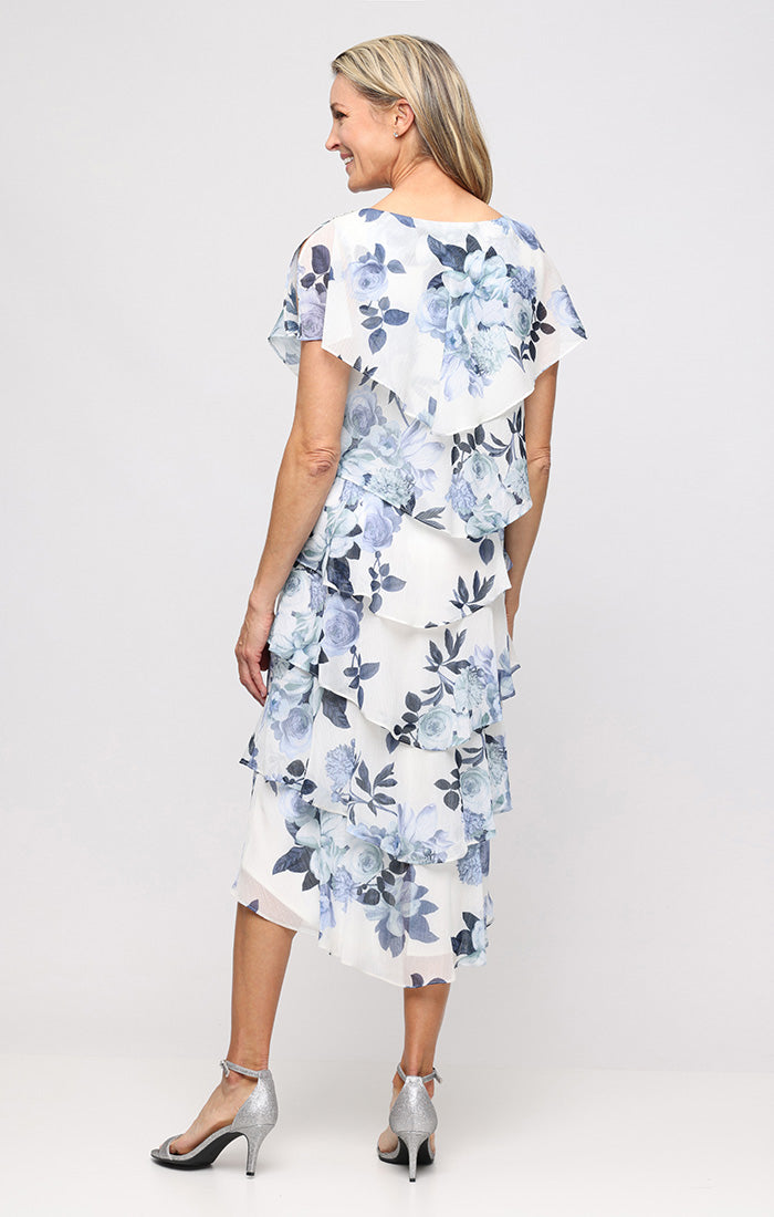 Tea Length Printed Tiered Dress With Capelet Sleeves and Embelilshment at Shoulders