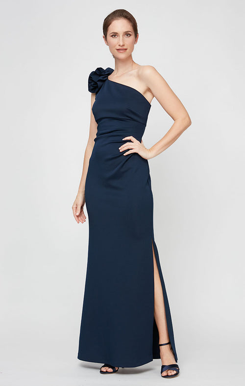 Petite One Shoulder Compression Dress with 3D Floral Shoulder Detail