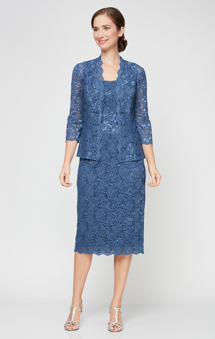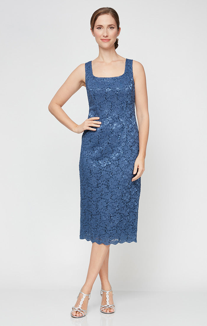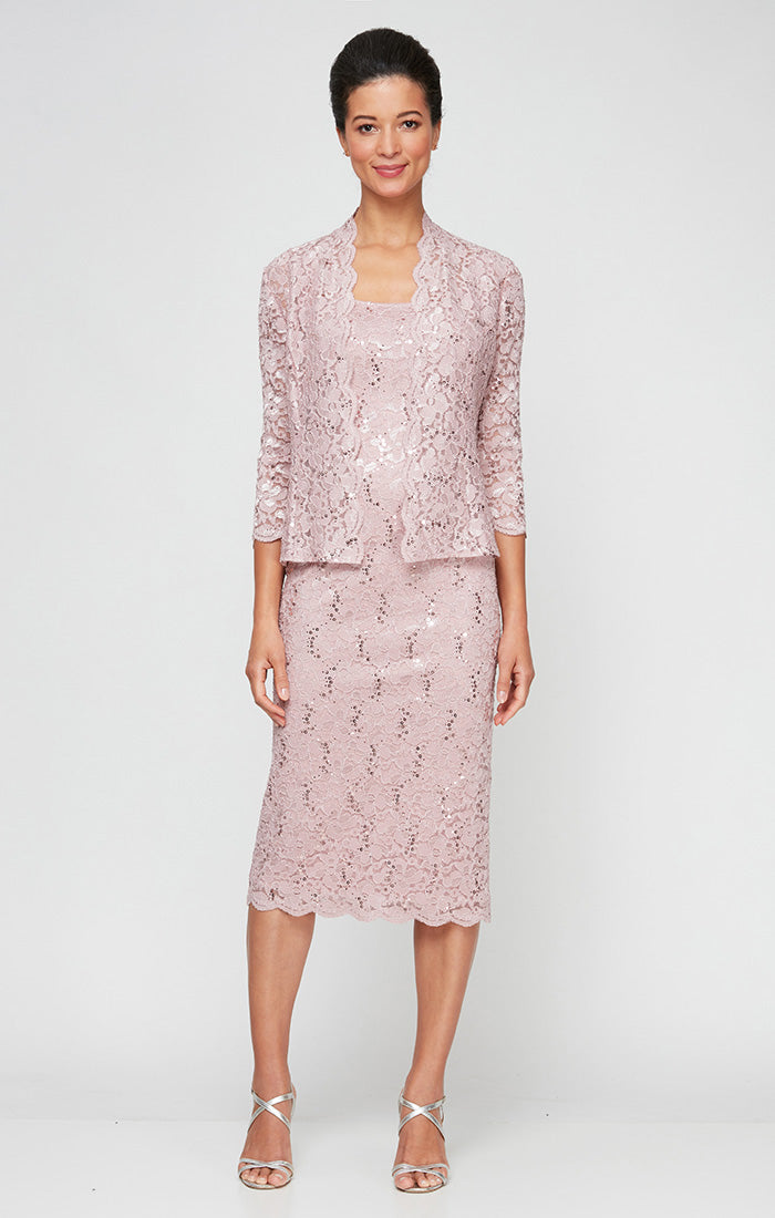 This tea-length petite dress is crafted from our comfortable lace fabric, making it perfect for your next event. It features elegant sequin detailing and a removable lace jacket, adding a touch of sophistication and versatility. Elevate your style with this stunning dress.