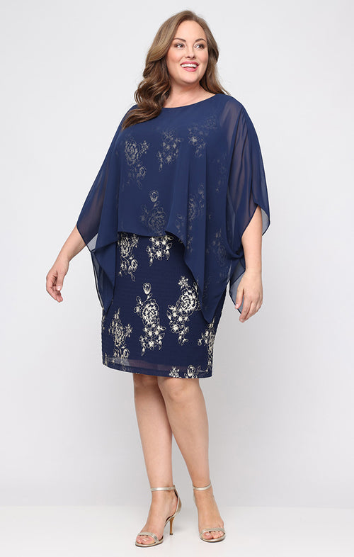 Plus Short Foil Pleated Sheath Dress with Chiffon Overlay Bodice