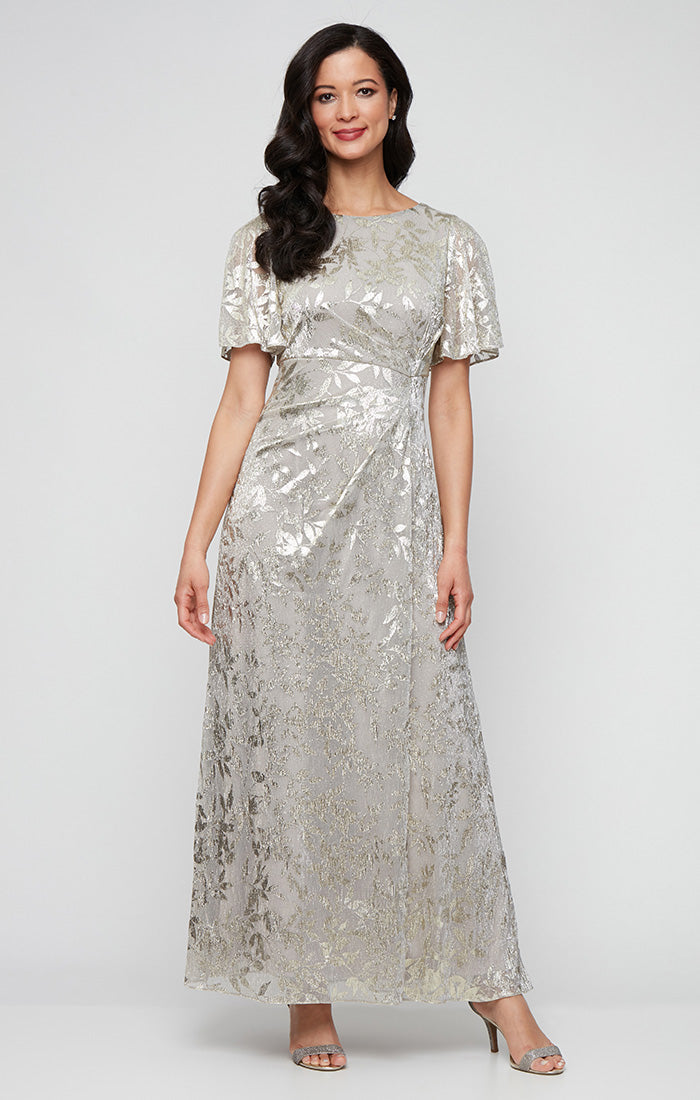 Long Foil Bodre Dress with Empire Waist and Flutter Sleeves