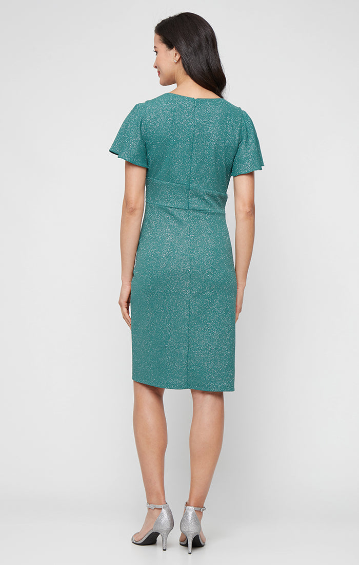 Short Glitter Knit Sheath Dress with Ruched Waist, Cascade Detail Skirt, Scoop Neckline and Embellished Flutter Sleeves