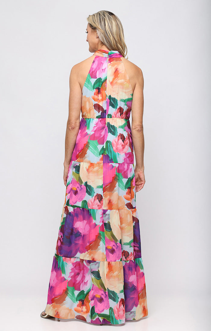 Long Sleeveless Printed Chiffon Halter Neck Dress