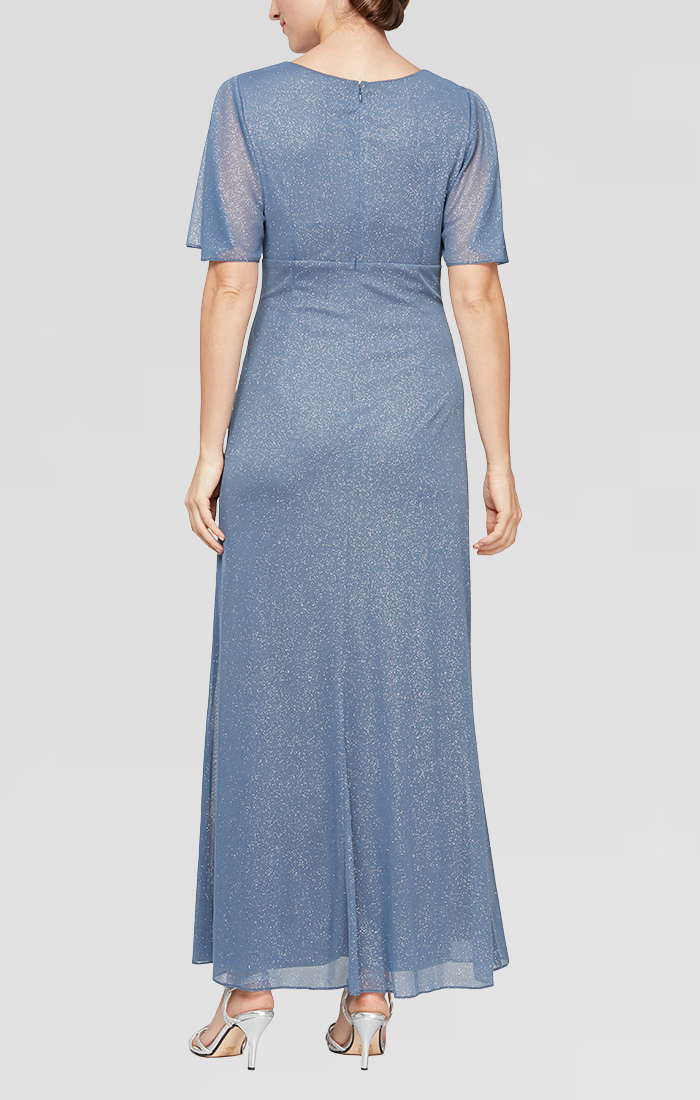 Petite Long A-Line Dress With Embellished Ruched Waist and Flutter Sleeves