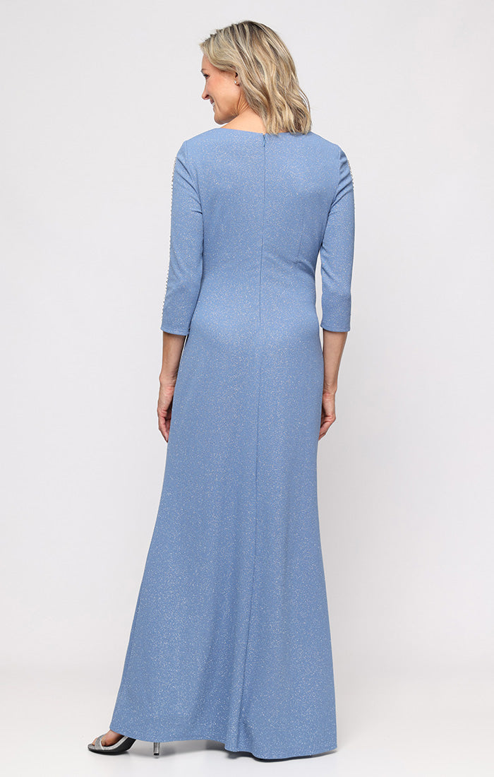 Long Glitter Knit Dress with Ruched Waist and Embellished Illusion Inset Sleeves