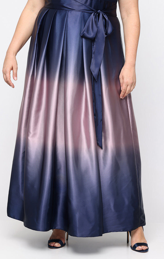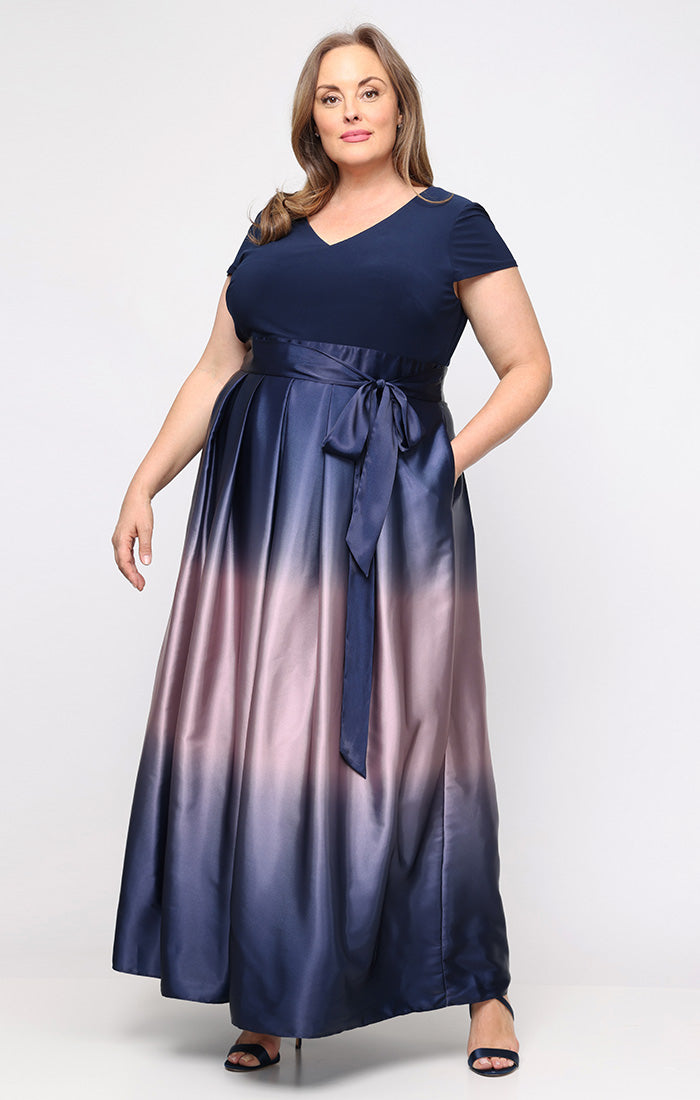 Plus Long Ombre Satin Ballgown with Matte Jersey V-Neck Bodice, Cap Sleeves and Tie Waist