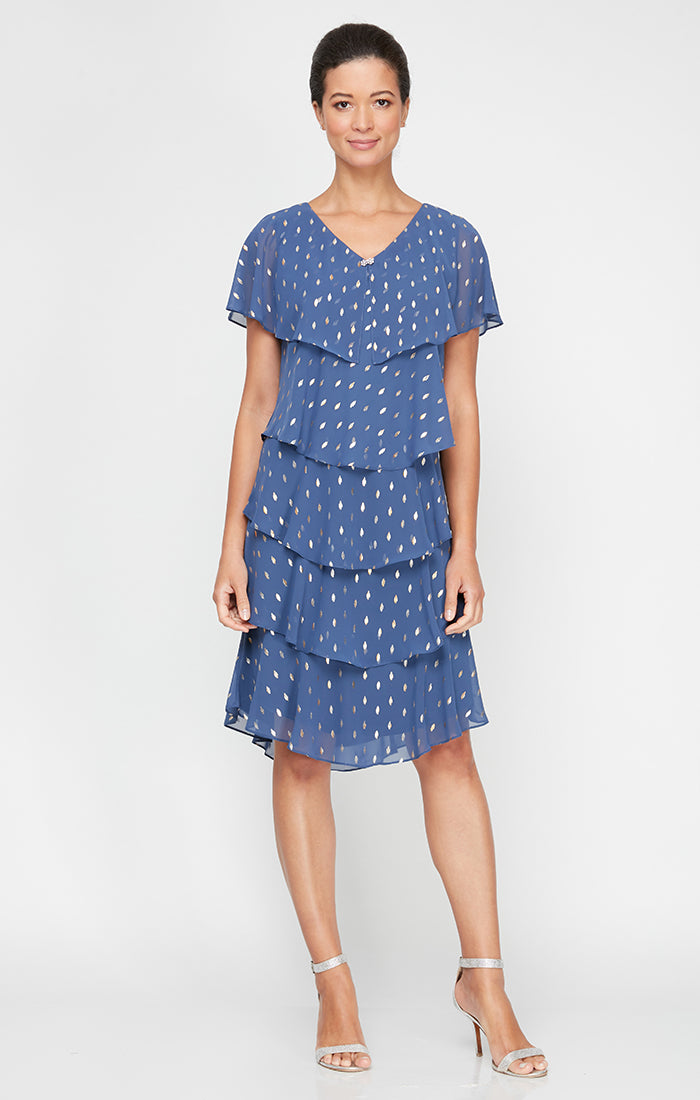This playful tiered dress in shimmering foil chiffon adds a fun and flirty flair to your wardrobe.
