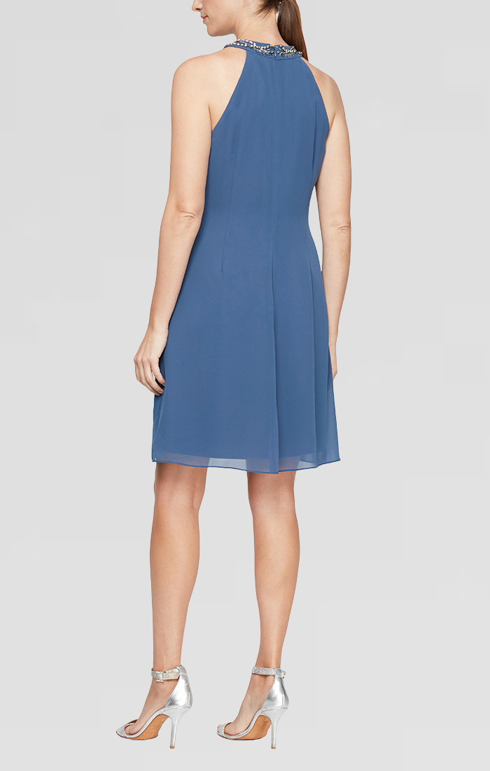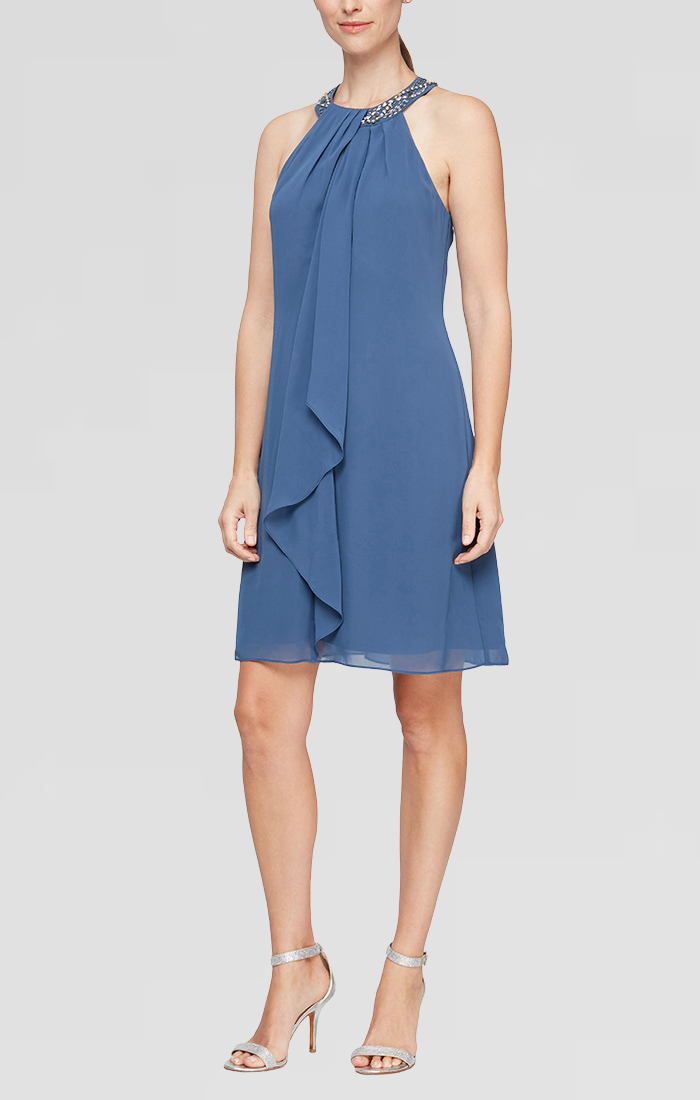 Petite - Beaded Neckline Chiffon Dress with Cascade Ruffle Detail
