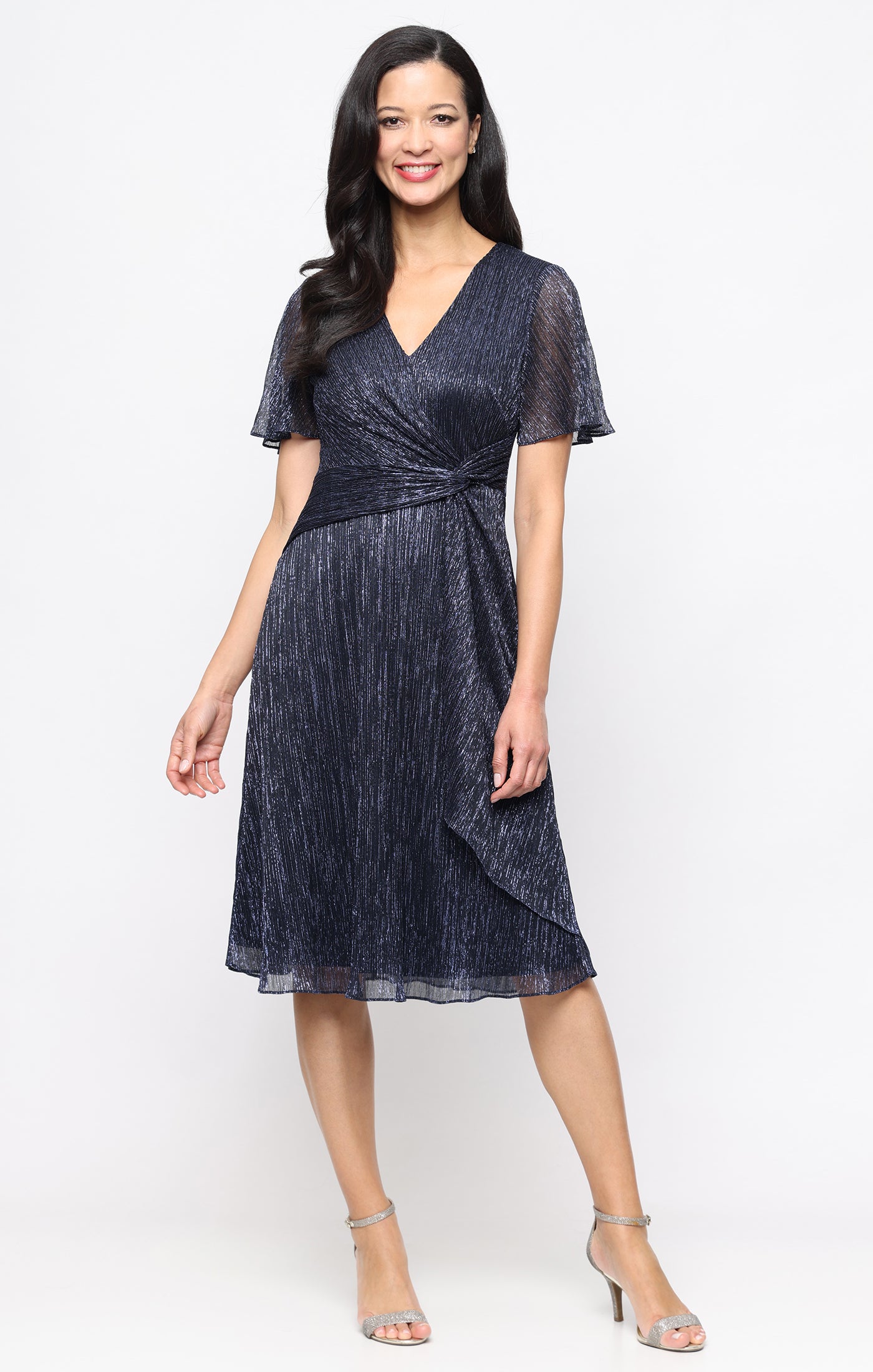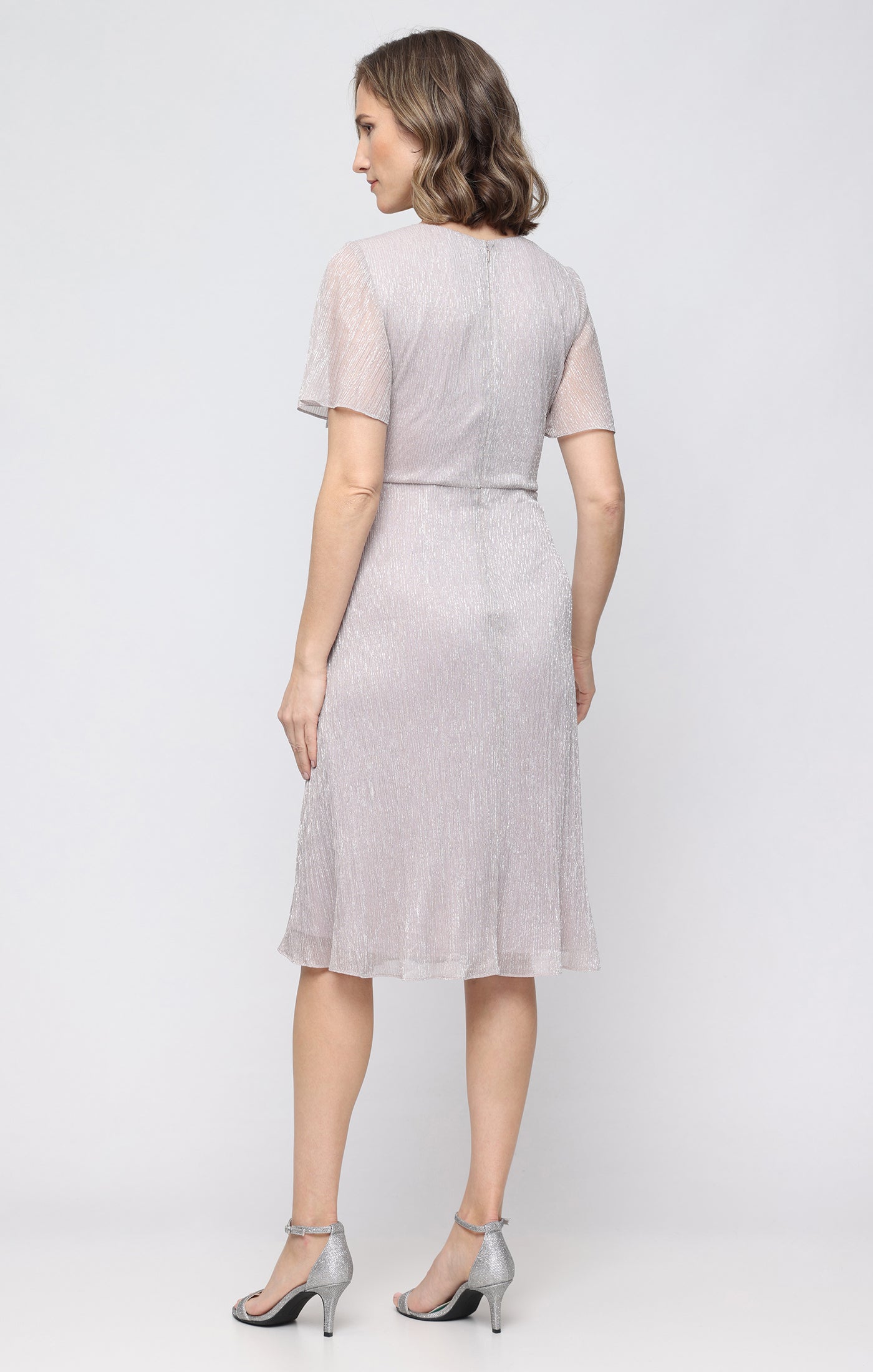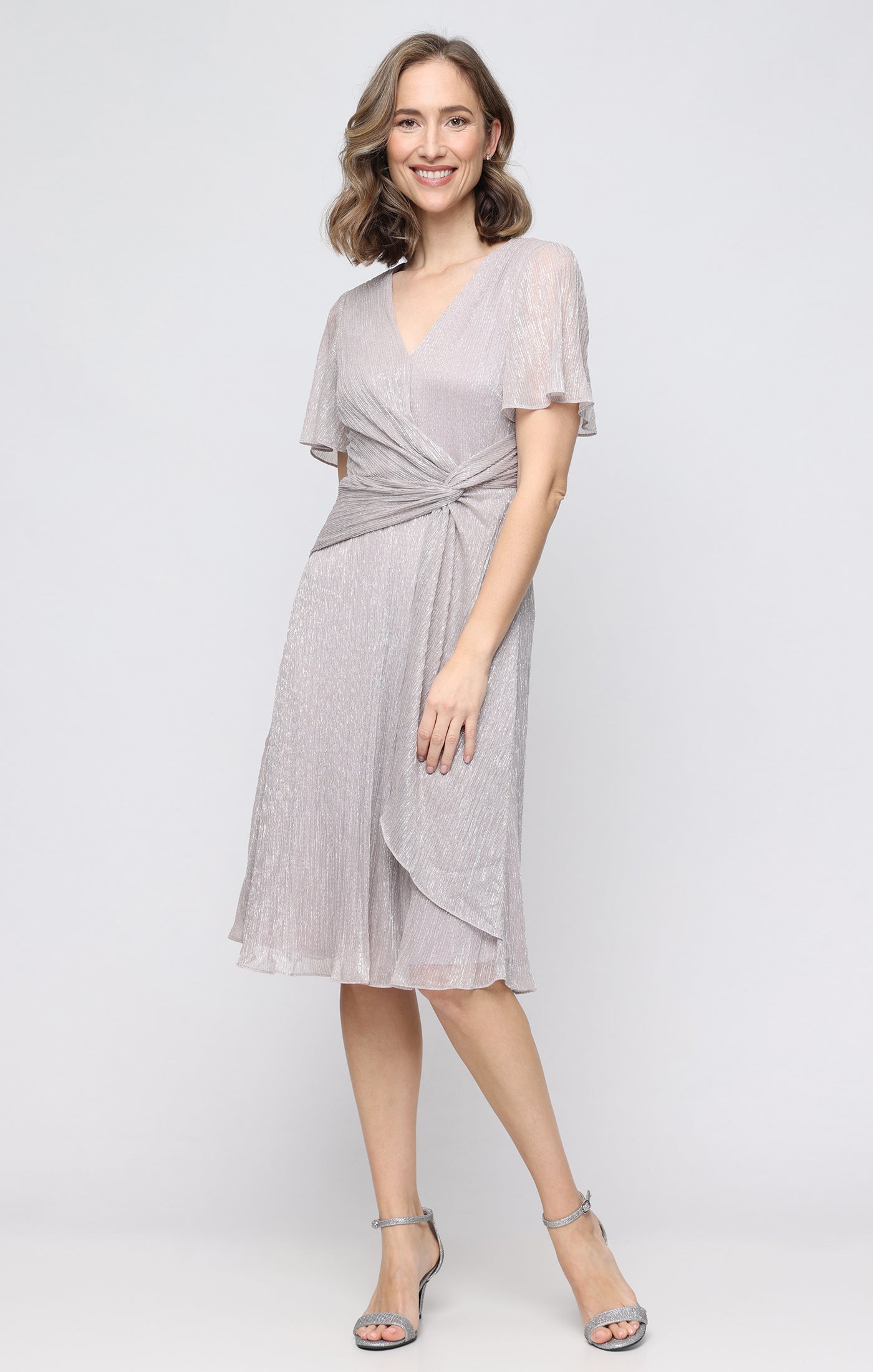 Effortless elegance meets playful charm in this tea-length dress. The surplice neckline flatters every frame, while flutter sleeves add a touch of whimsy. A stunning twist cascade detail at the waist creates movement and dimension, making this the perfect choice for weddings, cocktail events, or any occasion that calls for understated sophistication with a hint of fun.
